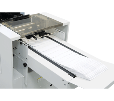 Set-up is quick and easy with rugged metal fold plates, clearly marked with both standard and metric markings, and fold rollers made of heavy-duty polyurethane foam, which eliminates the need for gap adjustments. The sealing unit utilizes a 17” ball transport deck for a smooth, reliable transition from the fold rollers into the sealer, and requires no adjustments.