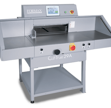 The Formax Cut-True 29A Electric Guillotine Paper Cutter offers precision cutting for paper stacks up to 20.5” wide. User-friendly, intuitive features include a touchscreen control panel, automatically-adjusting back gauge and the capacity to program up to 100 jobs/100 cuts. An infrared light beam safety curtain provides safety and convenience as it shuts down operation if the light plane is interrupted.