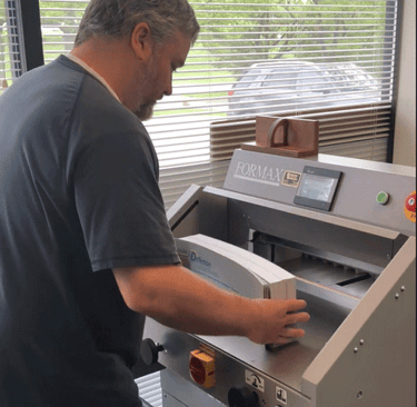 Brannen said some production facilities have larger format Guillotine cutters for high volume, large format stock, in wide open oily, dusty environments. He was looking for something closer to a clean room type cutter, and discovered that the Cut-True 29H was cleaner and had a small enough footprint that they could easily run it in one of their conference rooms.