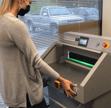 Operation is simple: utilize the touchscreen to program and select job settings, then load a stack of paper, up to 3.15” high. Set the back gauge using the touchscreen, then use the foot pedal pre-clamp to check the paper position. The bright LED Cutting Line allows operators to see exactly where the blade will cut and make fine adjustments. Electronically-controlled two-hand operation engages the hardened steel blade for crisp, accurate cuts, every time.