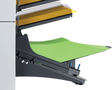 Its powerful folding capacity folds up to 10 sheets (half fold) or up to 8 sheets (tri-fold) at one time, plus Cascade Mode allows users to link feeders for continuous operation: when one feeder empties, another takes over.
