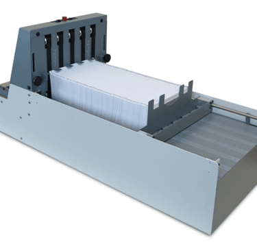 With photo-eye activation, the V-Stack36i neatly stacks up to 22 inches of folded documents. The infeed features a six-ball-roller deck and two guide wheels to ensure forms enter the stacker smoothly, and an LED lamp that alerts operators when the stacker is near full capacity. Its vertical paper stop adjusts to accommodate document sizes and fold types up to 7” high by 12″ wide.